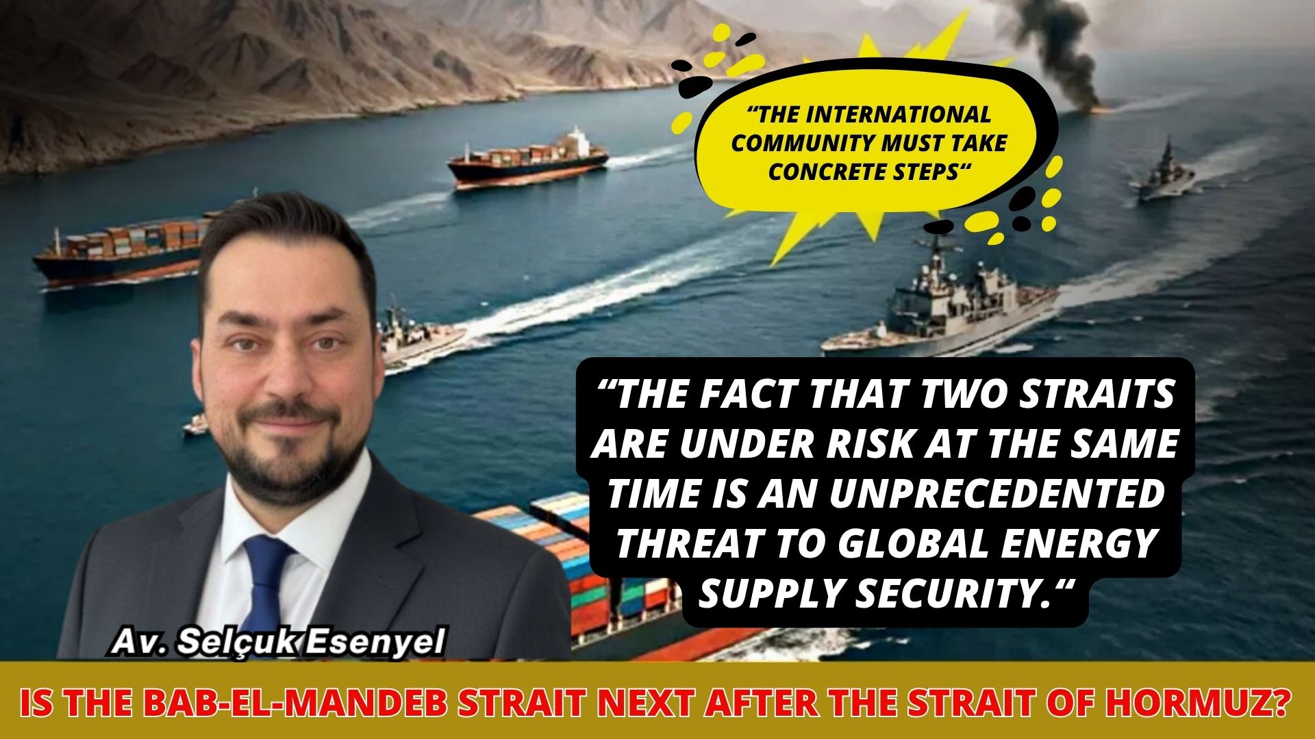 Following the Houthi missile attack from Yemen toward Israel, international attention has shifted to the Bab-el-Mandeb Strait at a time of rising tensions in the Strait of Hormuz. Highlighting that a total closure of the Strait of Hormuz would be unlawful, Selçuk Esenyel, Founding Partner of Esenyel & Partners and Maritime Law Expert, stated the following regarding the Bab-el-Mandeb Strait: